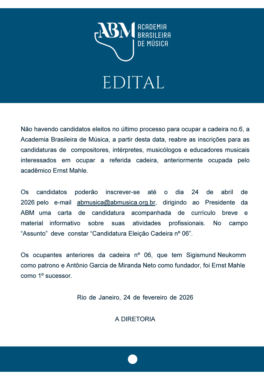 Não havendo candidatos eleitos no último processo seletivo para ocupar a cadeira nº 6, a Academia Brasileira de Música reabre, a partir desta data, as inscrições para compositores, intérpretes, musicólogos e educadores musicais interessados em ocupá-la. A cadeira foi anteriormente ocupada pelo acadêmico Ernst Mahle.